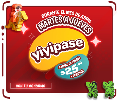 Continua en abril ven a divertirte sin límites, de MARTES A JUEVES nuestro YIYIPASE a MITAD DE PRECIO ¡Sólo 25 por persona!*