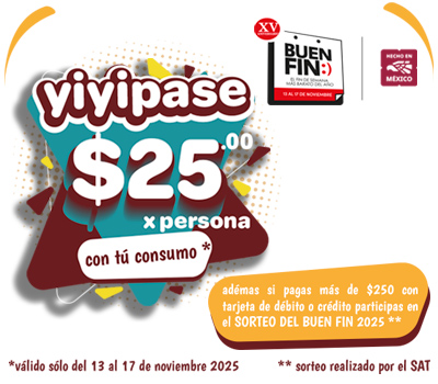 El MEJOR FIN DEL AÑOen el Yiyito Café. ESTE FIN DE SEMANA nuestro YIYIPASE a MITAD DE PRECIO ¡Sólo 25 por persona! con tu consumo. Adémas si tu cuenta es de $250 o más y pagas con tarjeta de débito o crédito, automáticamente participas en el sorteo del SAT.