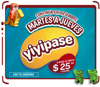 Continua en diciembre ven a divertirte sin límites, de MARTES A JUEVES nuestro YIYIPASE a MITAD DE PRECIO ¡Sólo 25 por persona!*