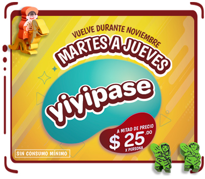 Vuelve en noviembre ven a divertirte sin límites, de MARTES A JUEVES nuestro YIYIPASE a MITAD DE PRECIO ¡Sólo 25 por persona!*